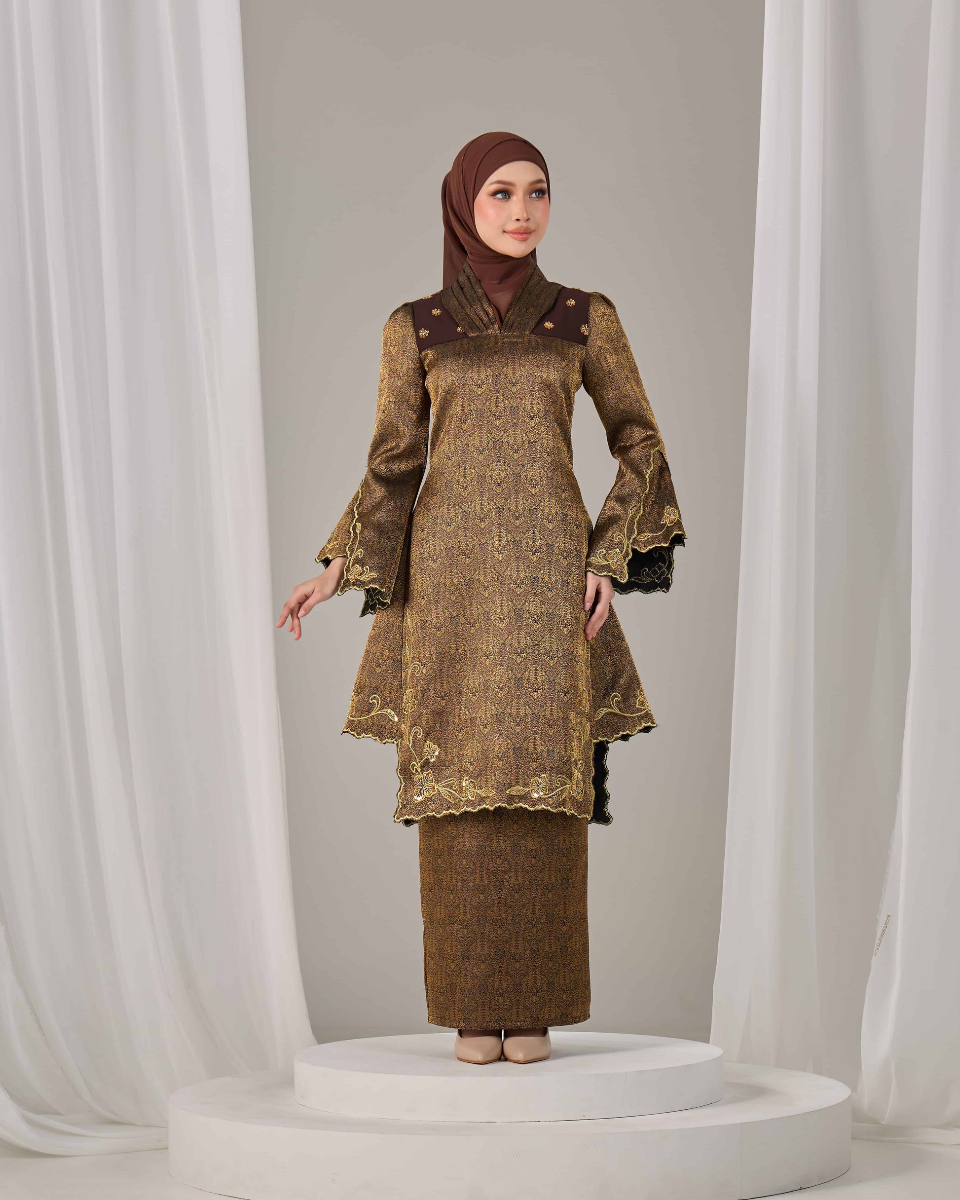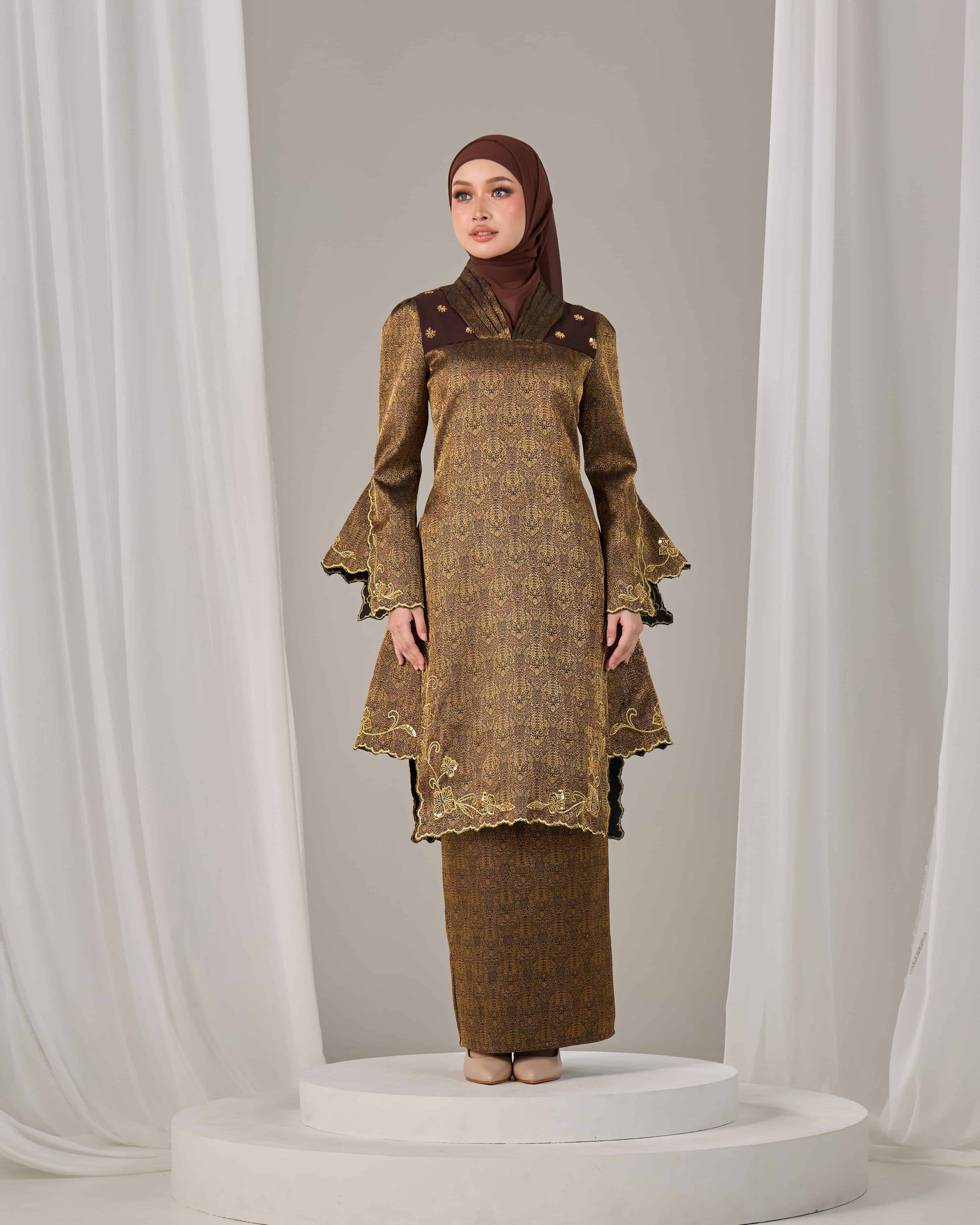 Jacquard / songket-inspired fabric with embroidery