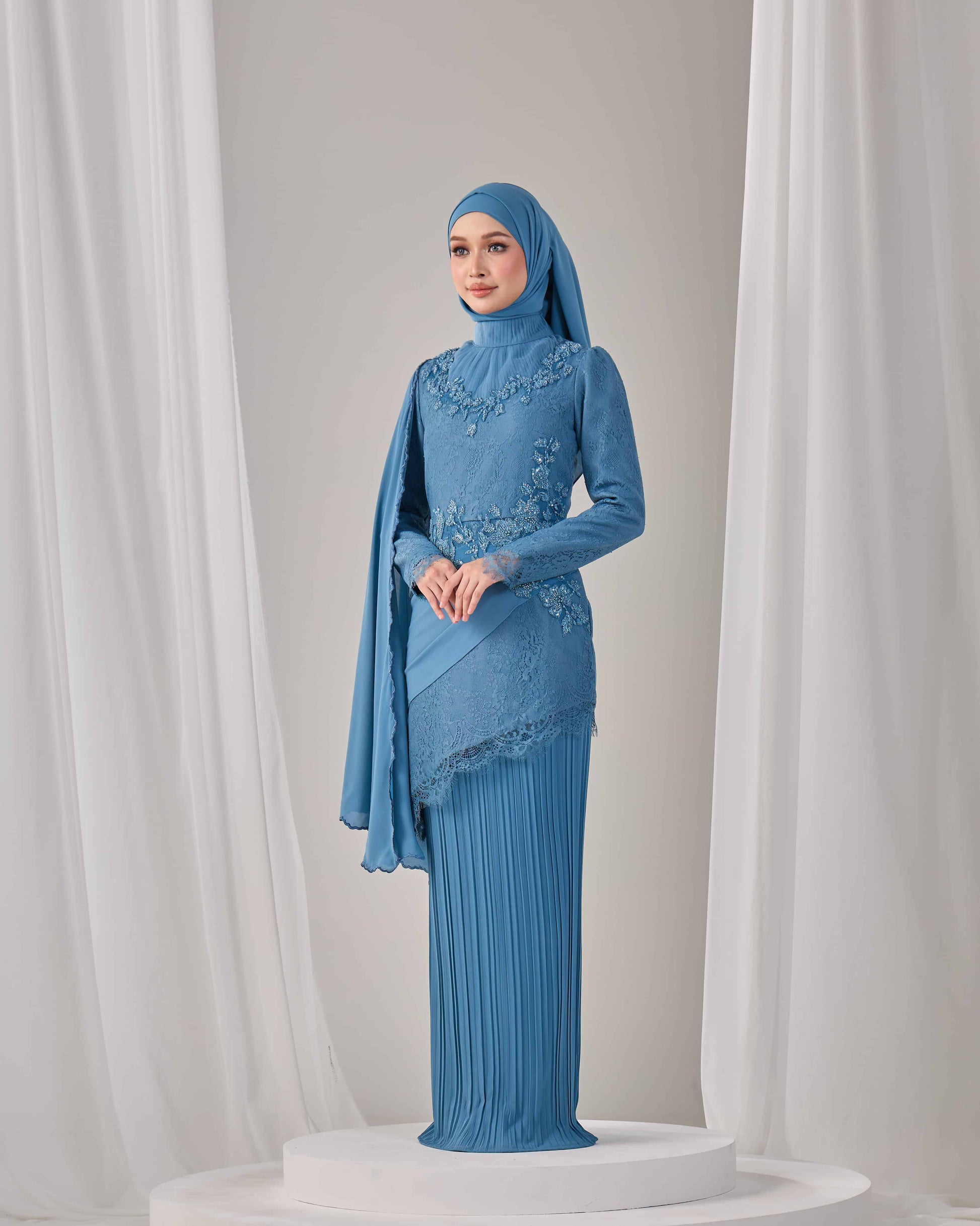 FRONT STYLE : Lace overlay with diagonal draped chiffon panel