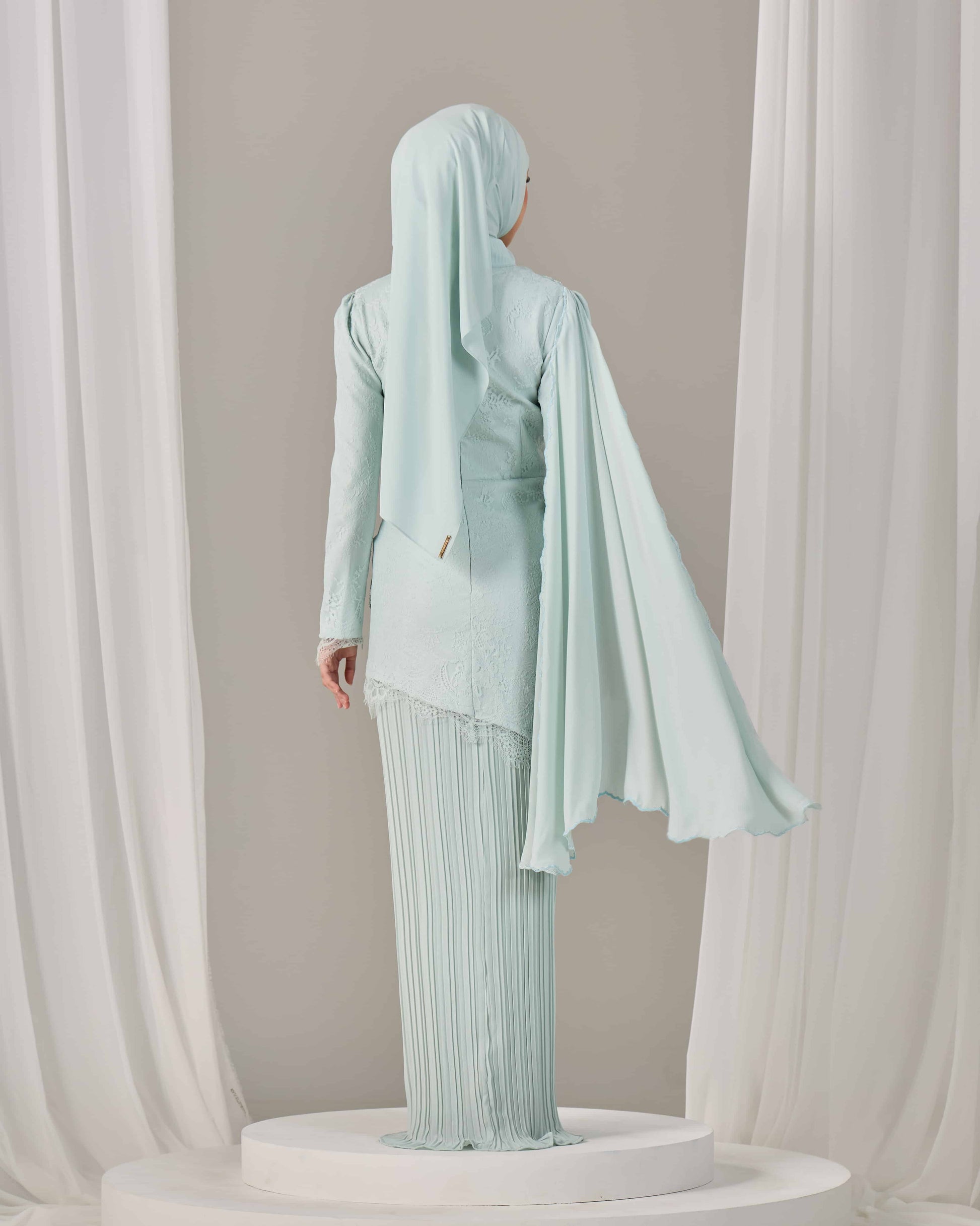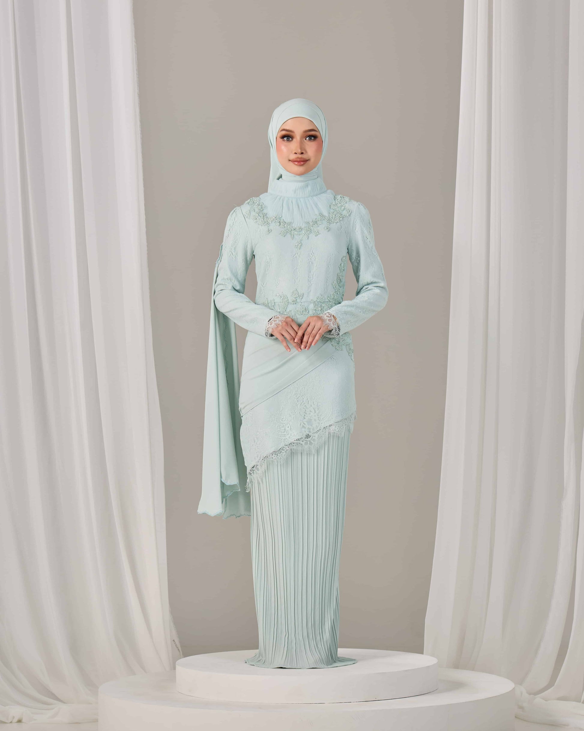 FRONT STYLE : Lace overlay with diagonal draped chiffon panel