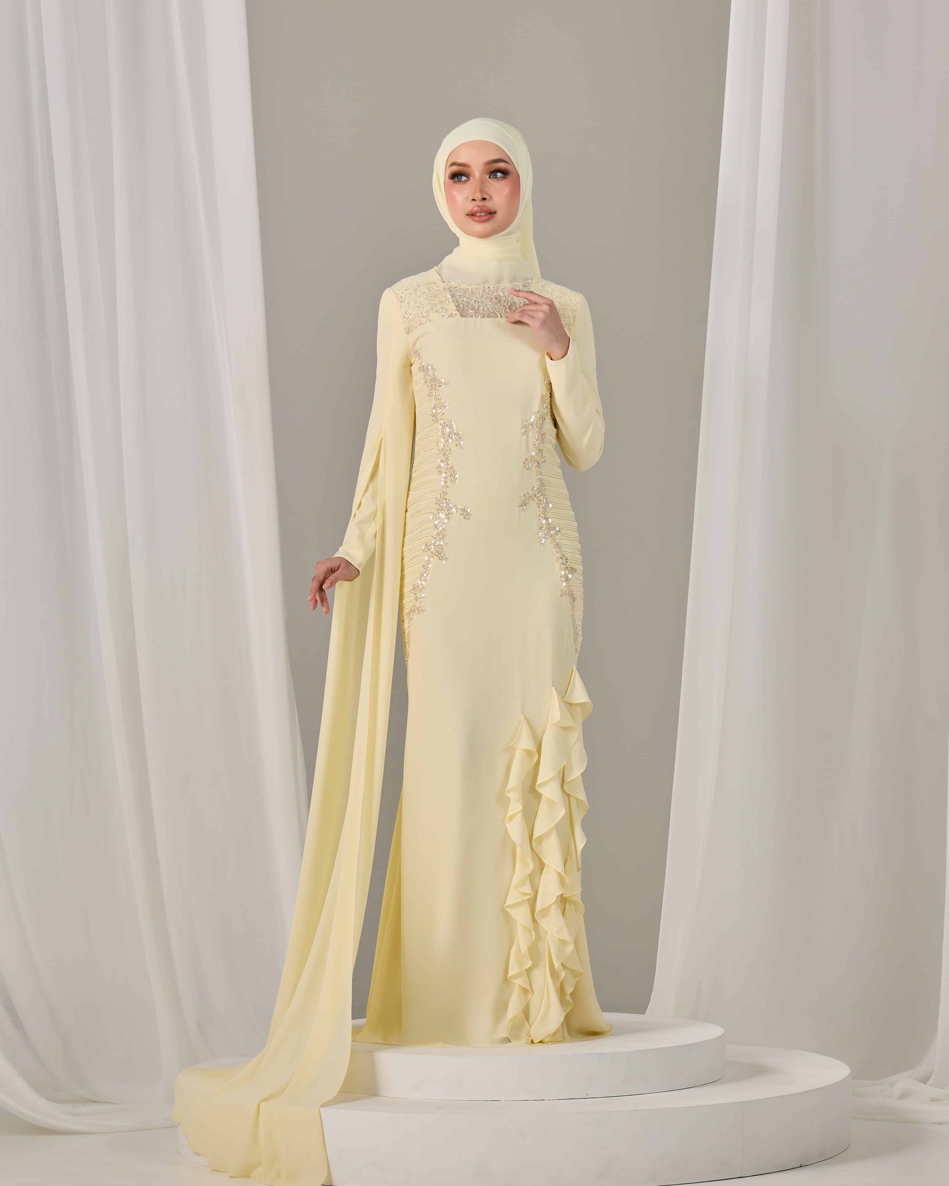 SLEEVE TYPE:Long fitted sleeves with attached chiffon cape