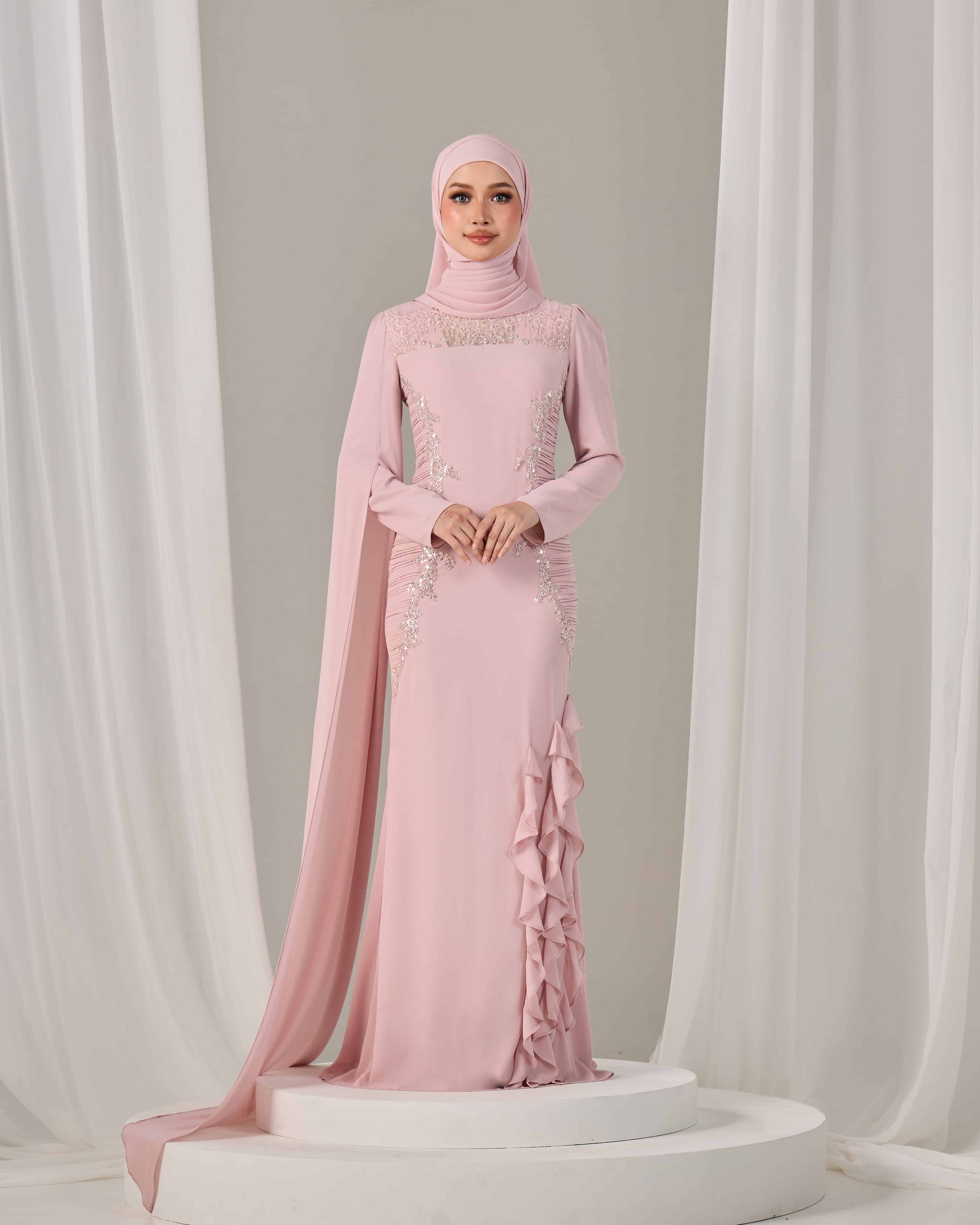 SLEEVE TYPE:Long fitted sleeves with attached chiffon cape