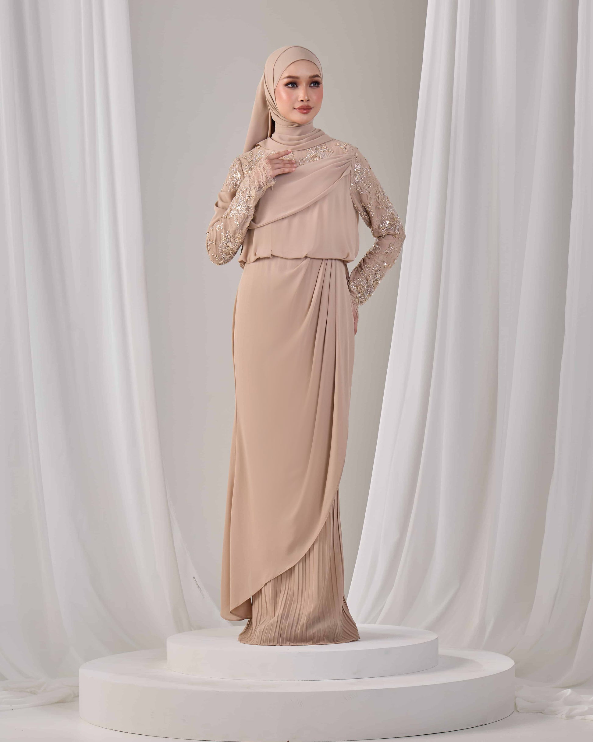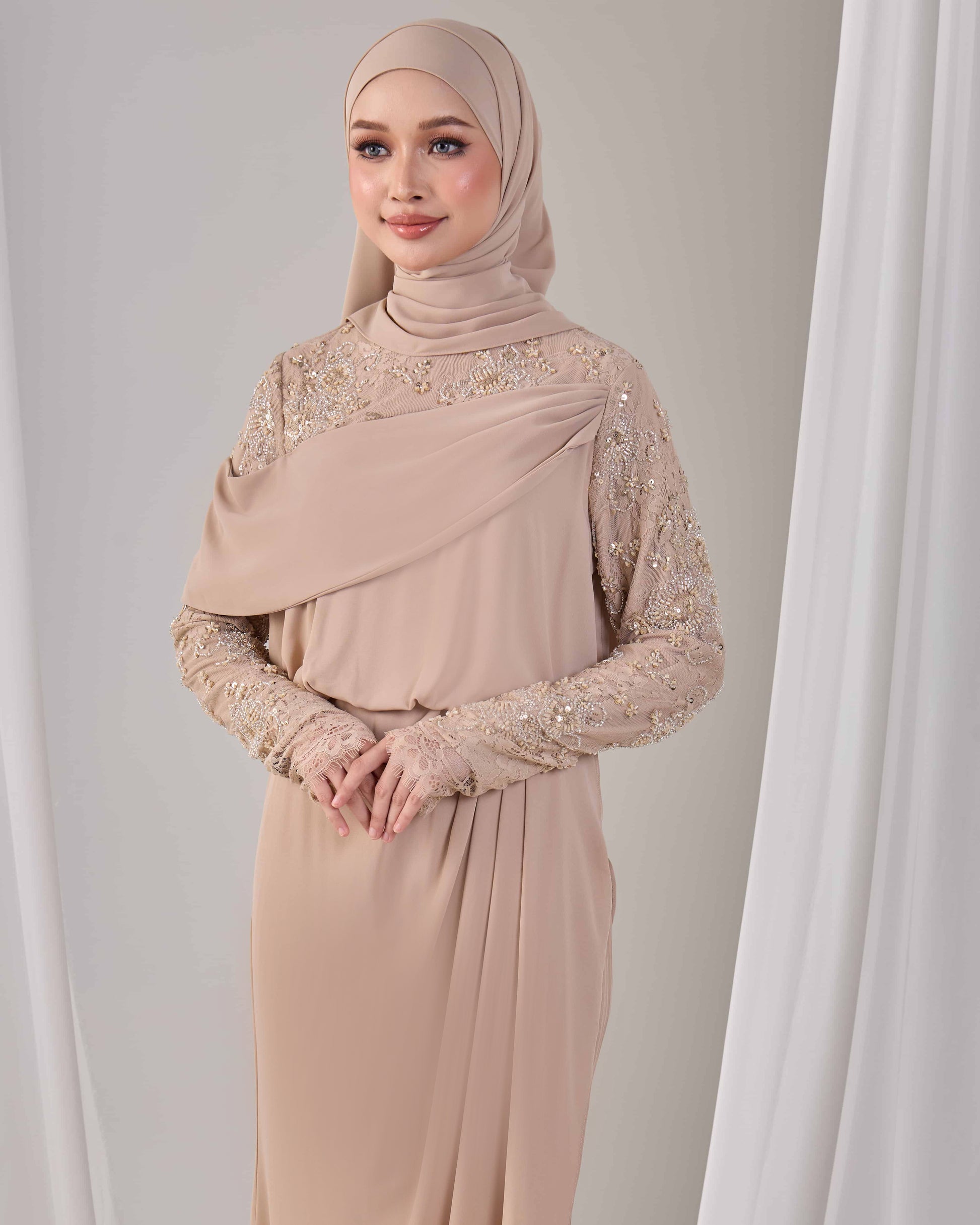 FRONT STYLE: Asymmetrical layered drape panel across bodice with soft gathered effect