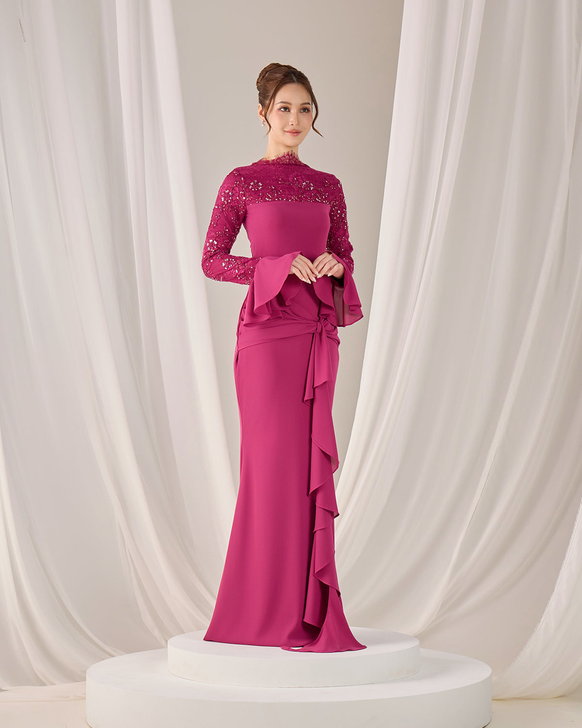 SLEEVE TYPE : Long lace sleeves with flared chiffon cuffs