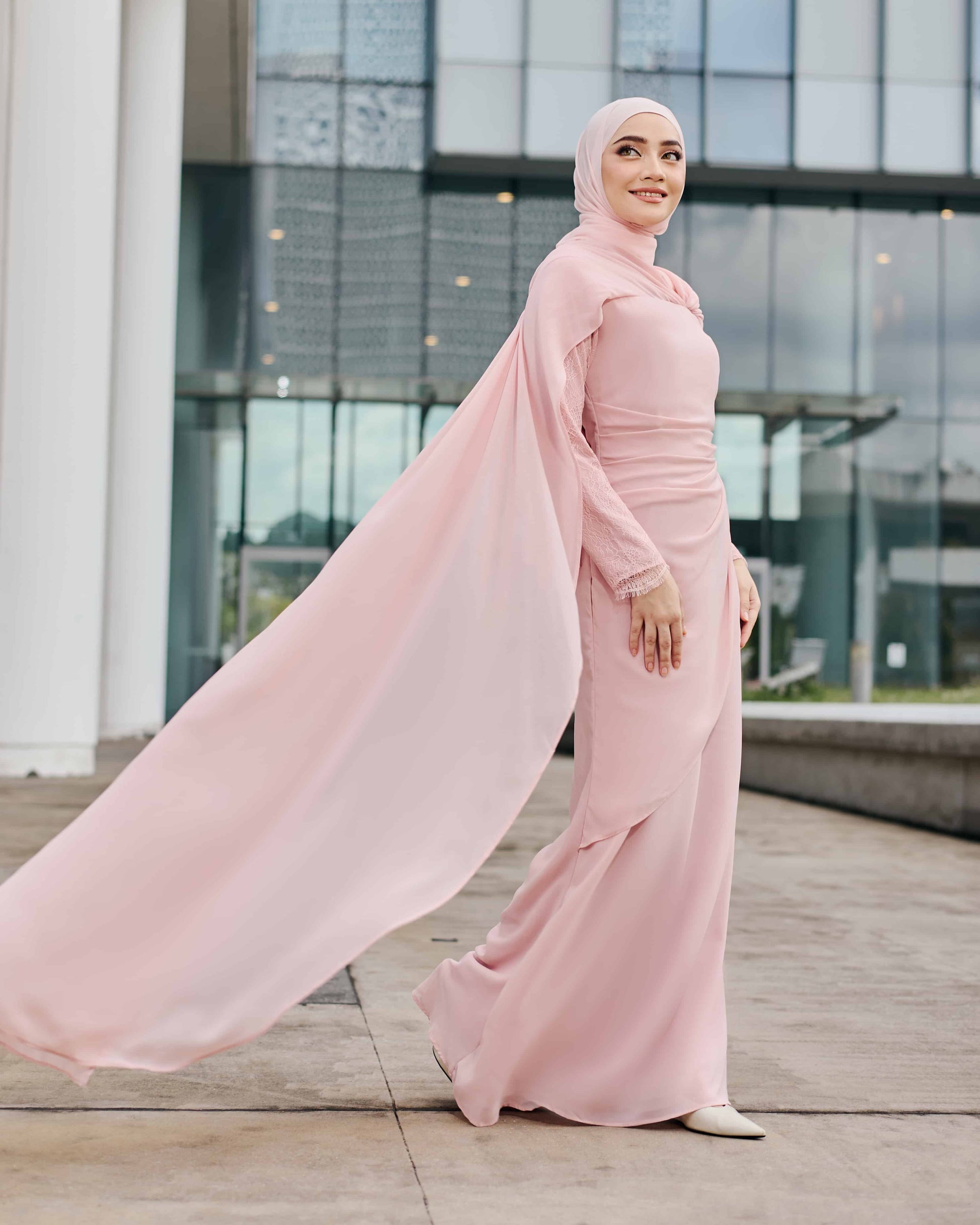 • Drapping effect with asymmetrical layered overlay at waist and skirt