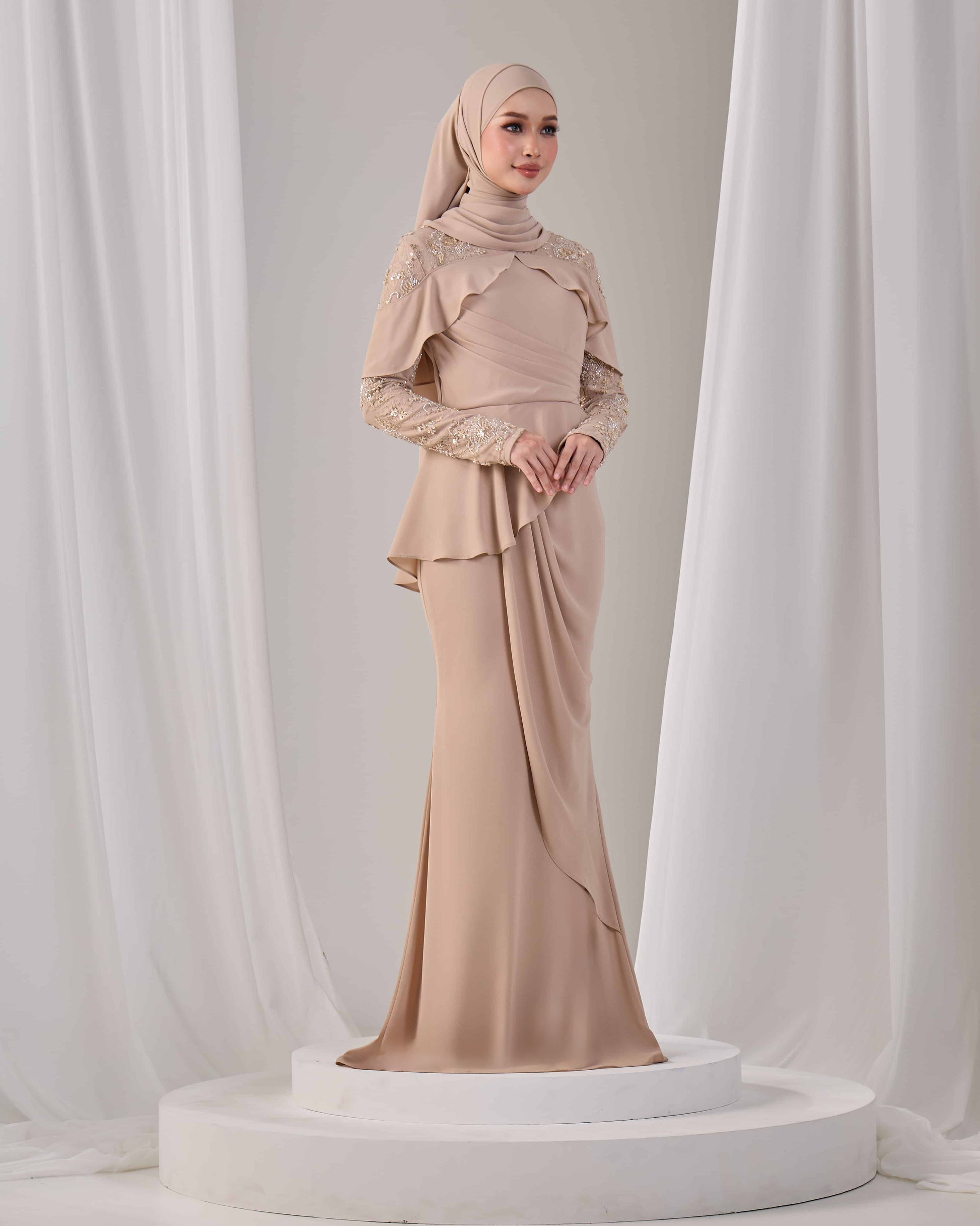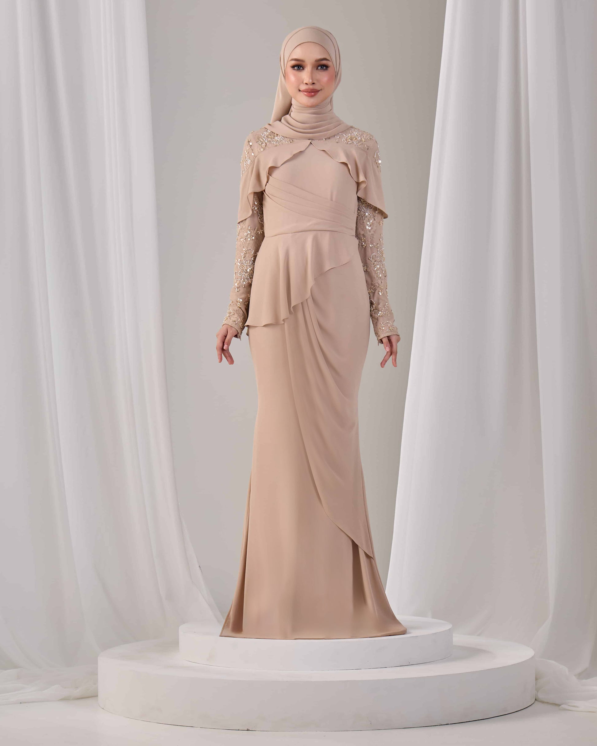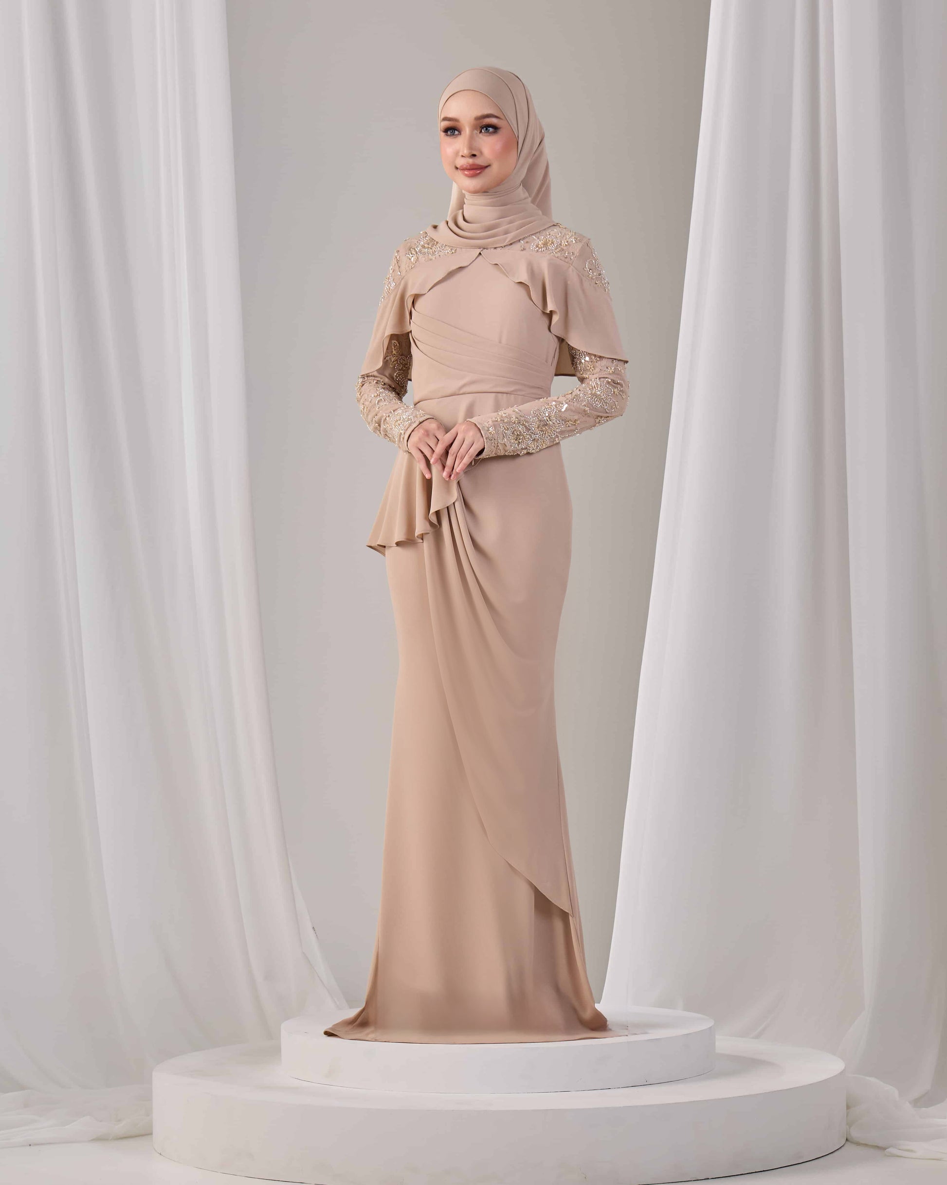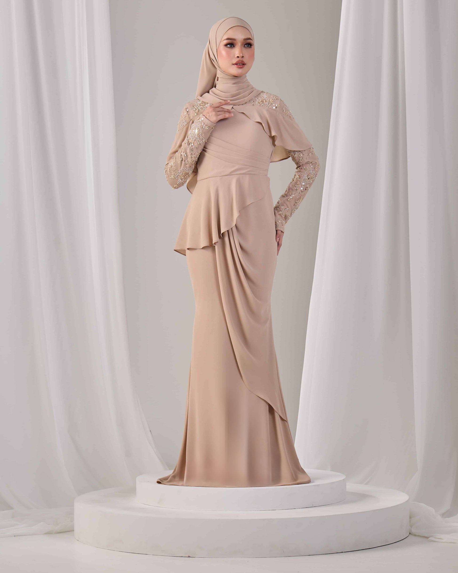 FRONT STYLE: Soft diagonal draping with layered peplum detail