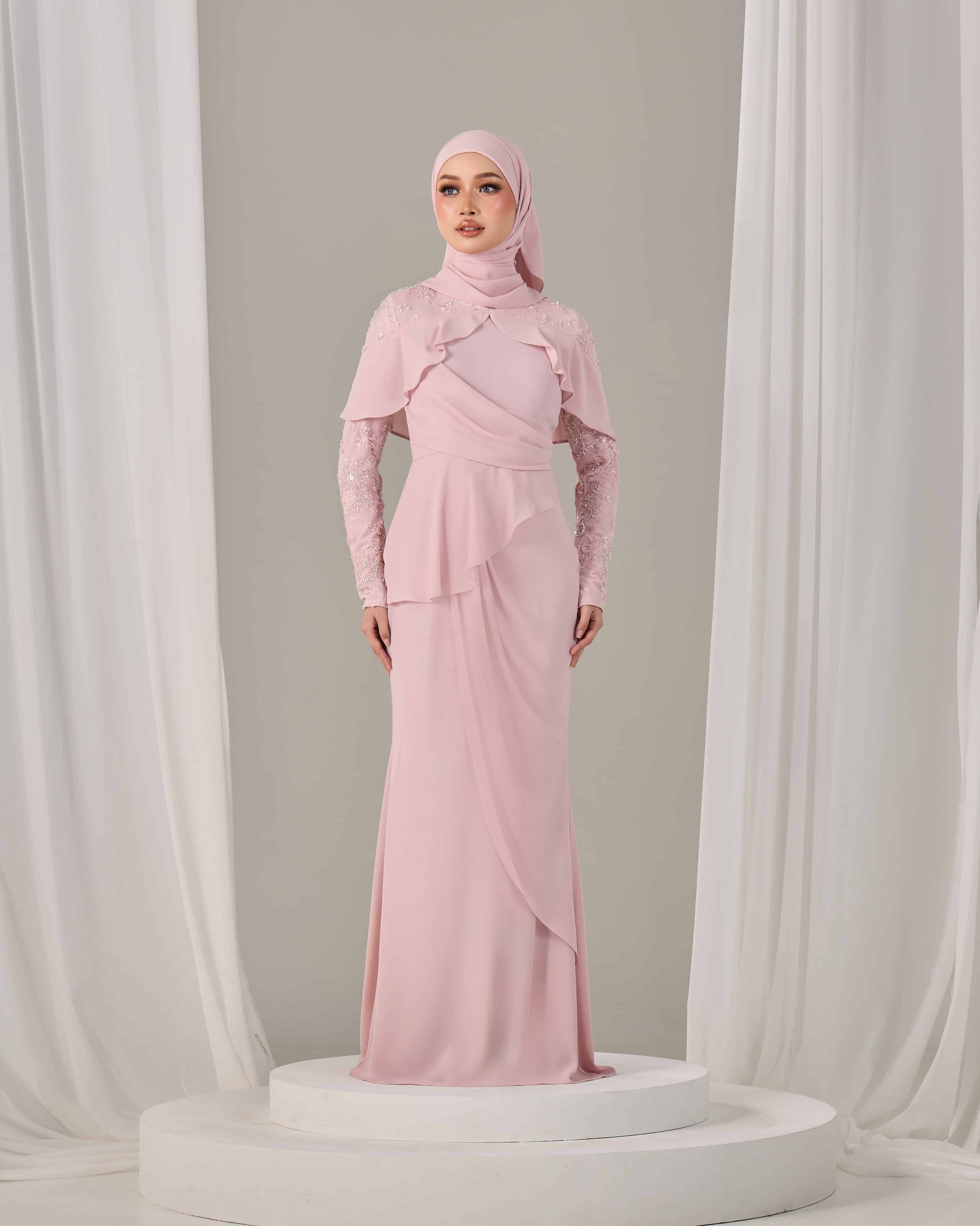 FRONT STYLE: Soft diagonal draping with layered peplum detail