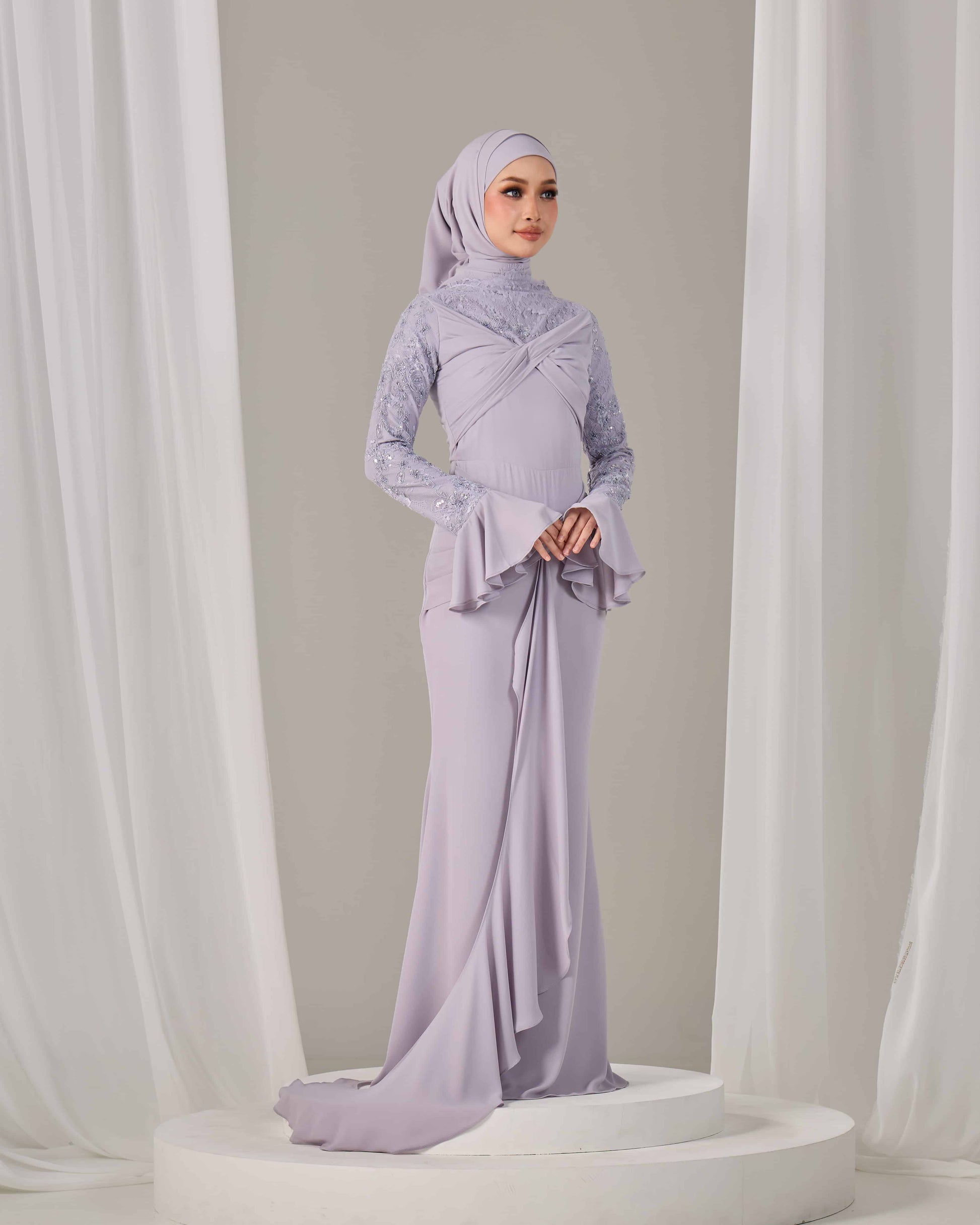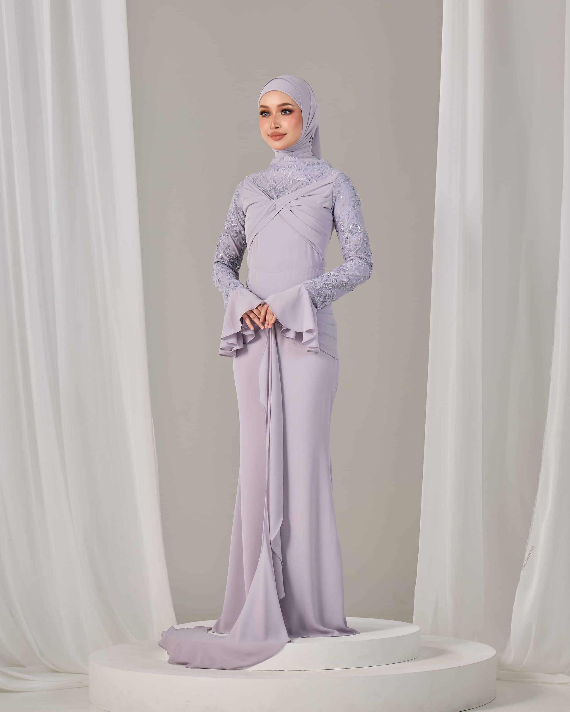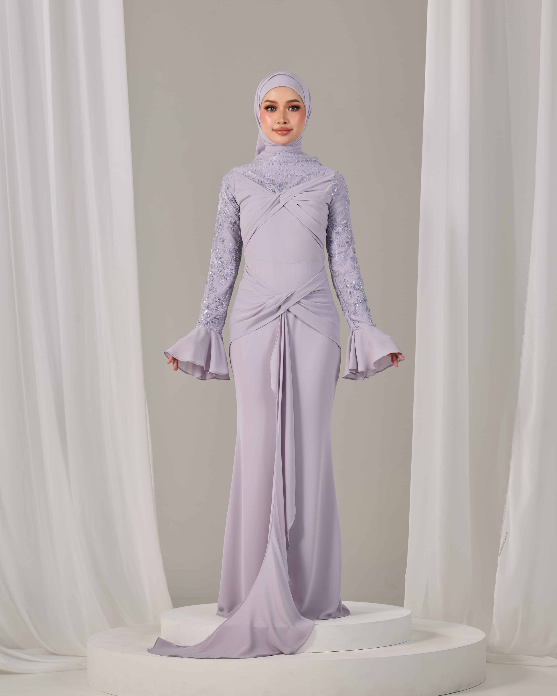SLEEVE TYPE : Long lace sleeves with flared chiffon cuffs