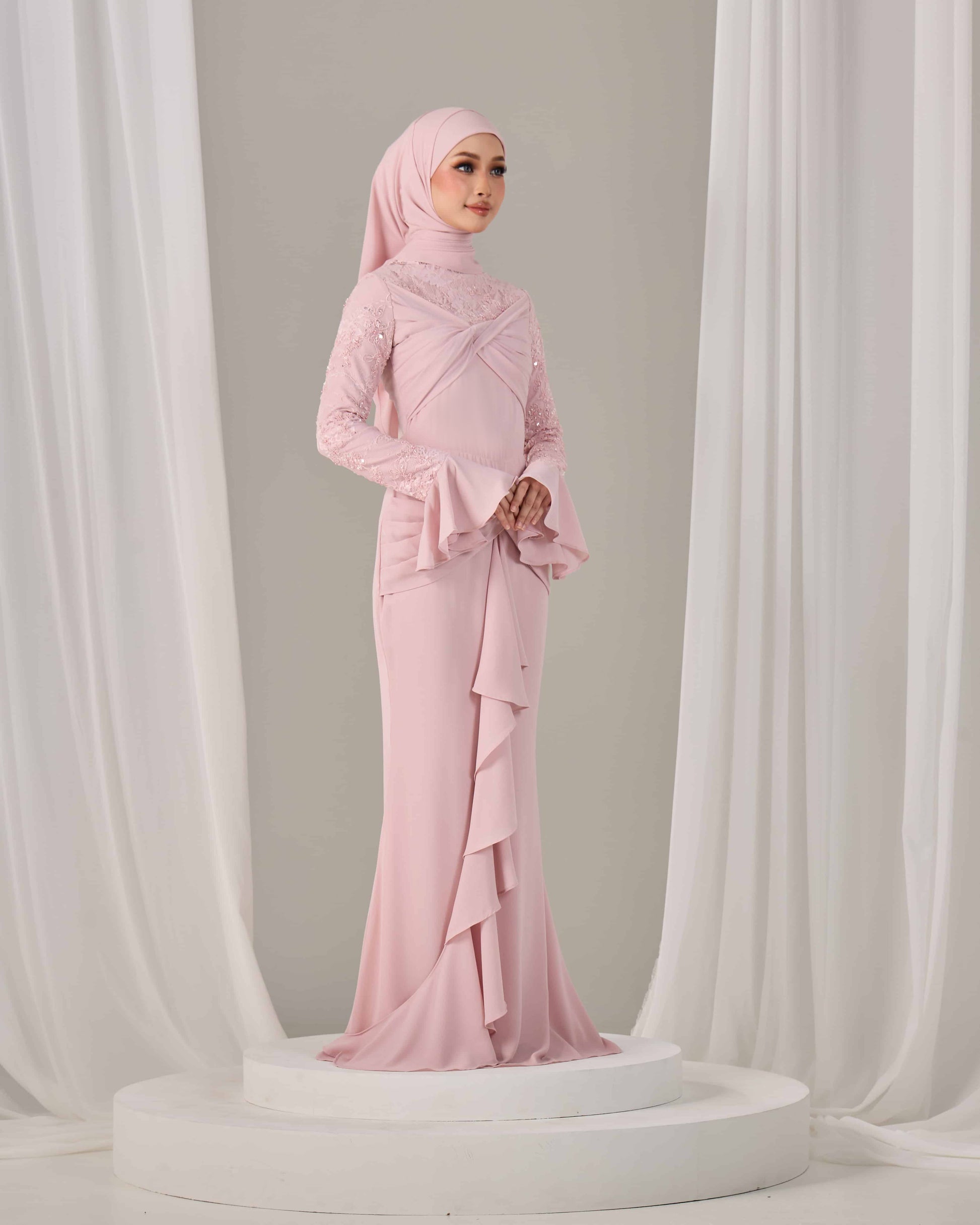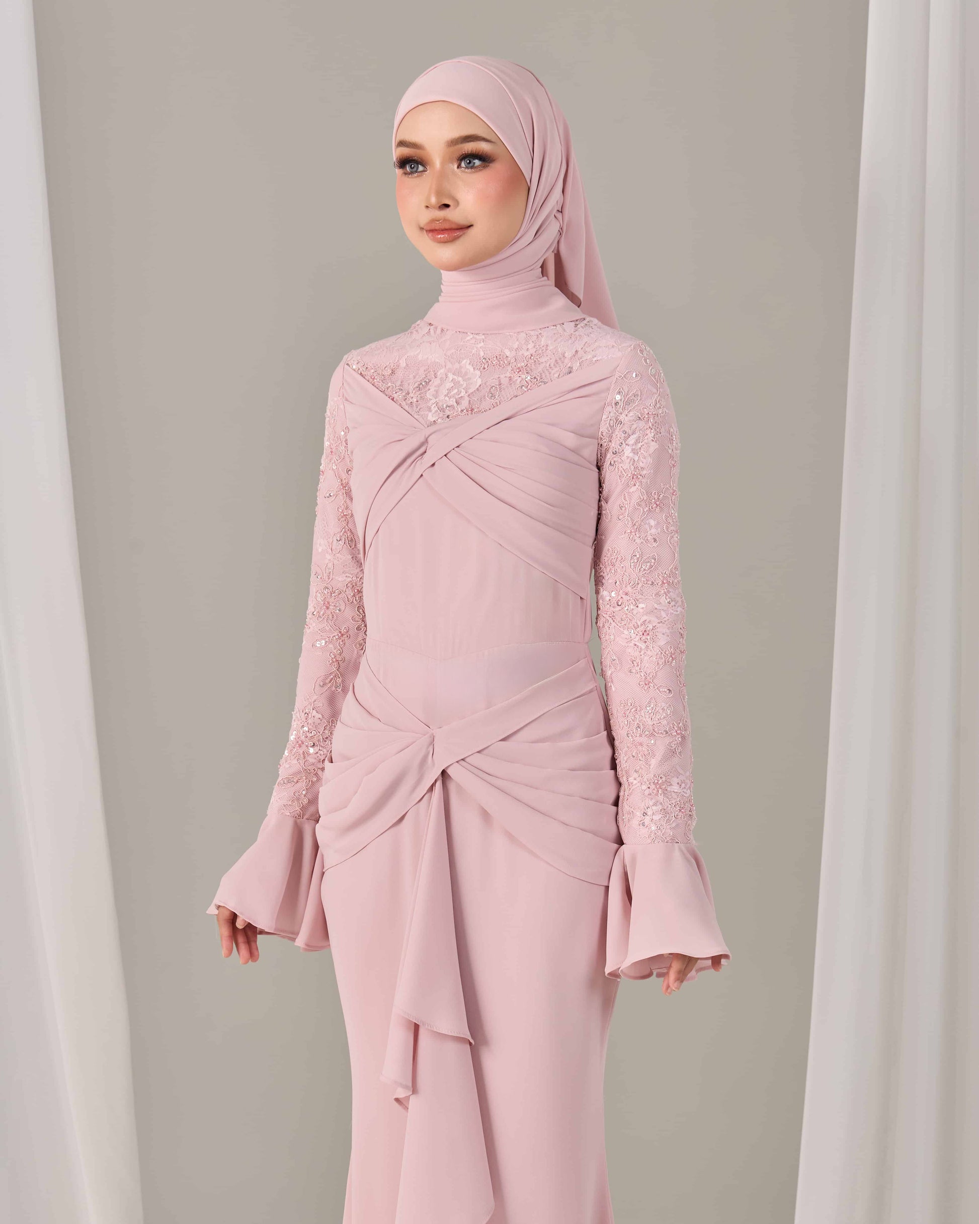 FRONT STYLE : Twisted draped chiffon crossing at bust and waist with cascading ruffle